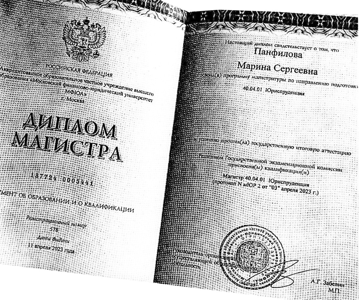 | 2023 | Диплом | 11.04.2023 | Магистр 40.04.01 Юриспруденция | Московский финансово-юридический университет (МФЮА) |